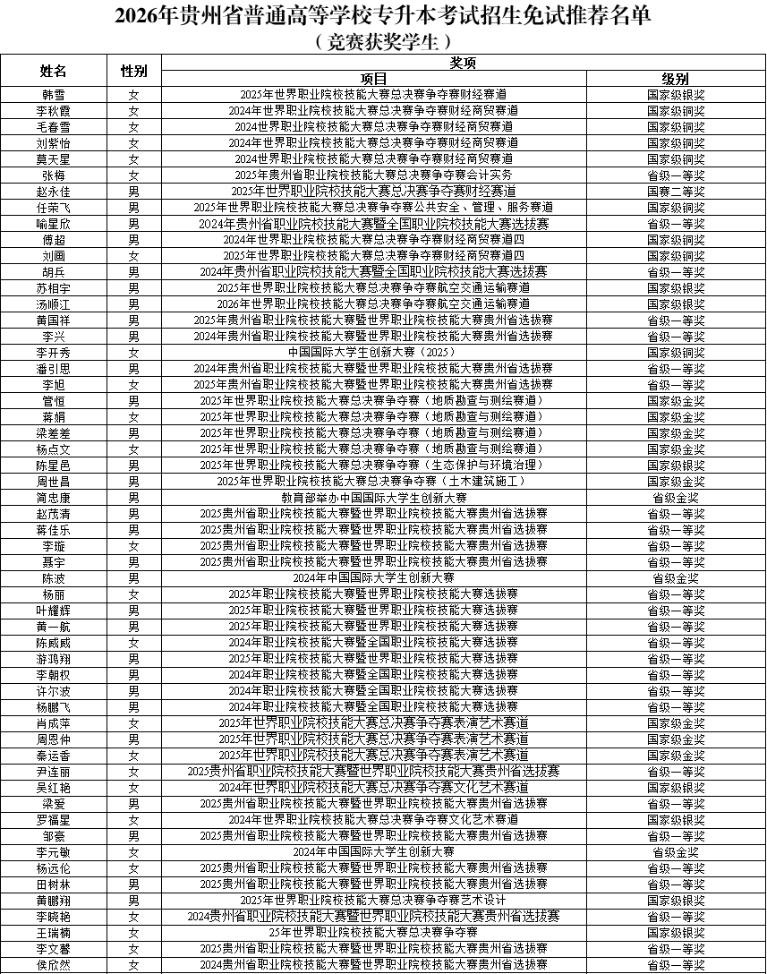 贵州职业技术学院2026年专升本免试生推荐名单公示