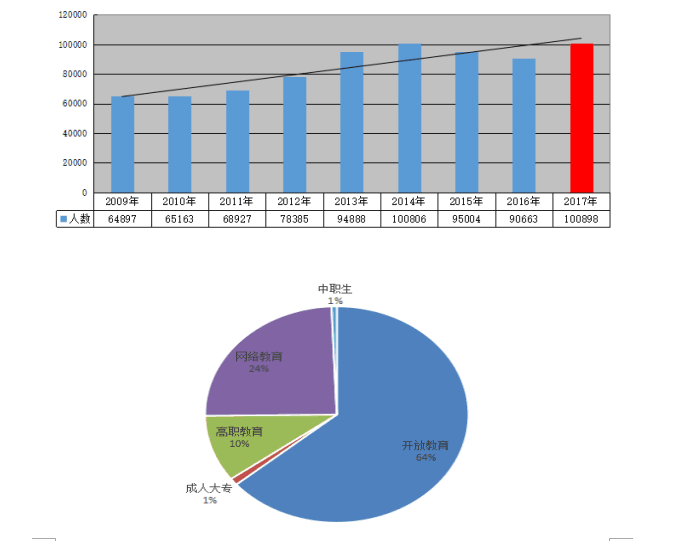 2017年在校生统计工作于日前全面结束,全省电大(高职)在校生规模继2014年后再次突破十万大关,并创历史新高,形势喜人。各办学类型在校生共计100898人,其中,开放教育(含一村一、助力计划)64373人,占63.80%;网络教育24766人,占24.55%;高职教育10057人,占9.23%;成人大专1061人,占1.05%;中职生641人,占0.64%。2009—2017年在校生柱状图和目前各类型在校生占比图如下: