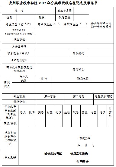 1.《贵州职业技术学院分类招生报名表及承诺书》填写完整并盖章和贴照片。(在学校官网下载http://www.gzvti.com/info/1041/6869.htm)。
