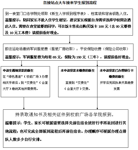 下面是流程图和接待点示意图(含自行报到和各接站点集中乘车),同学们可以提前了解。