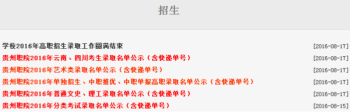 截止至8月17日,经各省招生考试院审核通过,我院2016年录取已经全部结束,录取结果及通知书快递单号已通过短信的方式发送到你的手机上。当然,你还可以通过以下几种方式查询本人录取情况及录取通知书邮寄单号。