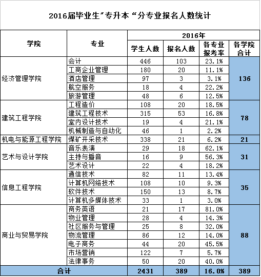 数据显示,今年学院“专升本”报名学生人数与去年持平,占2016届毕业生总数的16.0%。为了使学生能够顺利报名,我中心在报名前期就主动联系省内本科院校,建立起“专升本”工作合作关系,为每个专业的学生争取到更多可供选择的报考院校、对口专业、计划,确保了学生后期的有效报考。