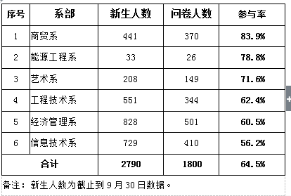 为进一步把握近年招生录取特征和规律,了解新生进校后身心适应性状况,为招生工作和学生管理工作提供数据支撑,9月18日—9月28日,由招就中心牵头实施、各系支持的新生调查工作正式开展。此次调查针对2015级新生通过网上答卷的方式进行。截止到10月7日,全院1800名新生网上提交问卷,参与率达64.9%。各系参与情况见下表: