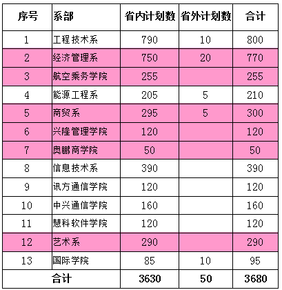 今年我院面向贵州、四川、云南计划招收47个专业(含方向)高职(专科)新生3680名,六系及所属的二级学院、国际学院(筹)省内外招生计划如下表: