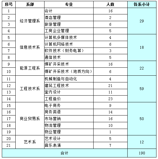 4月21日,随着市招生考试院审核数据的反馈,我院2014年“专升本”考试报名工作顺利结束,此次六系共有190名2014届学生登记报考并经学生处、教务处审核合格。各系学生报名情况如下:
