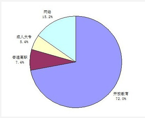 从各类型办学来看,开放教育(含一村一)在校生68317人,同比增加11436人,增幅达20%;网络教育在校生14458人同比增加3103人,增幅达27%;普通高职在校生7023人同比增加1017人,增长17%;成人大专在校生5090人,同比增加947人,增长23%。目前,开放教育占在校生总规模的72%,主体地位进一步巩固;网络教育占在校生总规模的15.2%,高职教育占在校生总规模的7.4%,成人教育占在校生总规模的5.4%。
