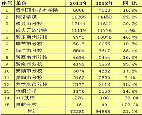 从各分校(学院)来看,在校生规模上万人的分校达到3家,分别是遵义分校、成开院和黔东南分校。增幅排列前两位的黔东南分校和铜仁分校达到或接近40%;网络学院、黔南、遵义增幅在20%以上;毕节分校、安顺分校、贵州职院、黔西南分校、六盘水分校、水钢分校增幅在10%以上;成开院、贵阳分校也有小幅增长。在两所成人分校中,011技校在校生规模与去年相比有较大幅度下滑,贵航分校在校生规模基数较小,未能突破50人。(见下表)