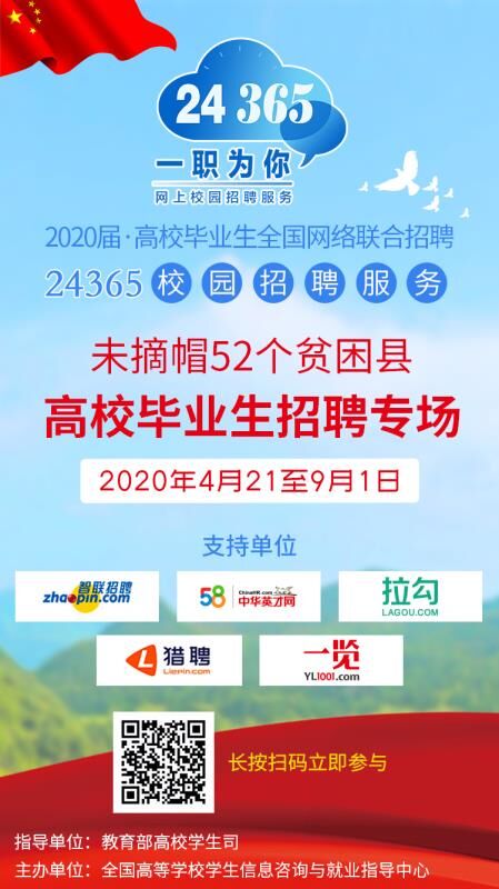 新华网北京4月27日电 为助力脱贫攻坚、促进贫困地区大学生就业,2020年4月21日至9月1日,教育部全国就业中心联合智联招聘、拉勾网等社会招聘平台,依托教育部大学生就业网(新职业网)举办“24365校园招聘”52个未摘帽贫困县高校毕业生招聘专场活动,目前已汇集招聘企业3.1万余家,招聘岗位信息63万余条。