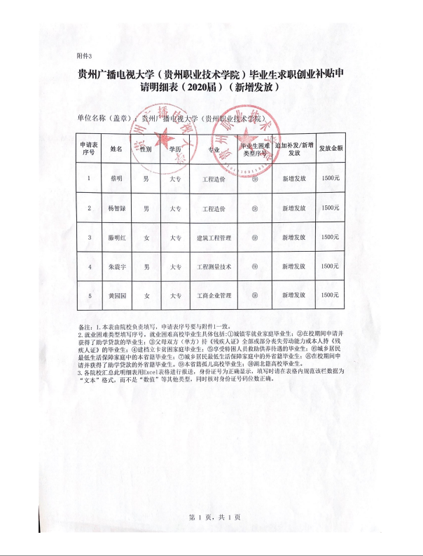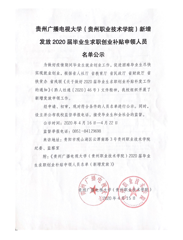 贵州广播电视大学(贵州职业技术学院)新增发放2020届毕业生求职创业补贴申领人员名单公示