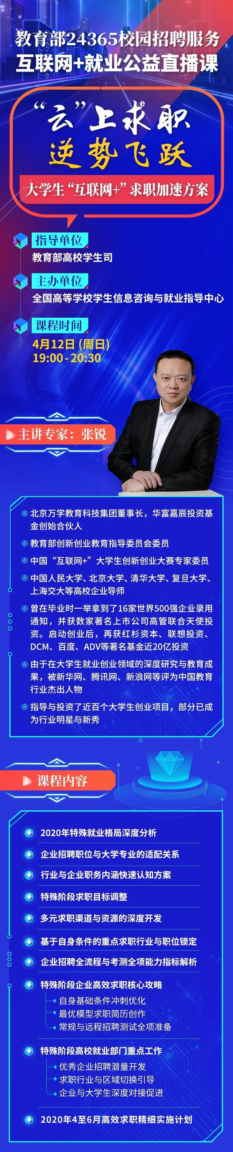 教育部24365校园招聘服务就业指导公益直播课第二期的“云”上求职 逆势飞跃---大学生“互联网+”求职加速方案课程即将在线直播。
