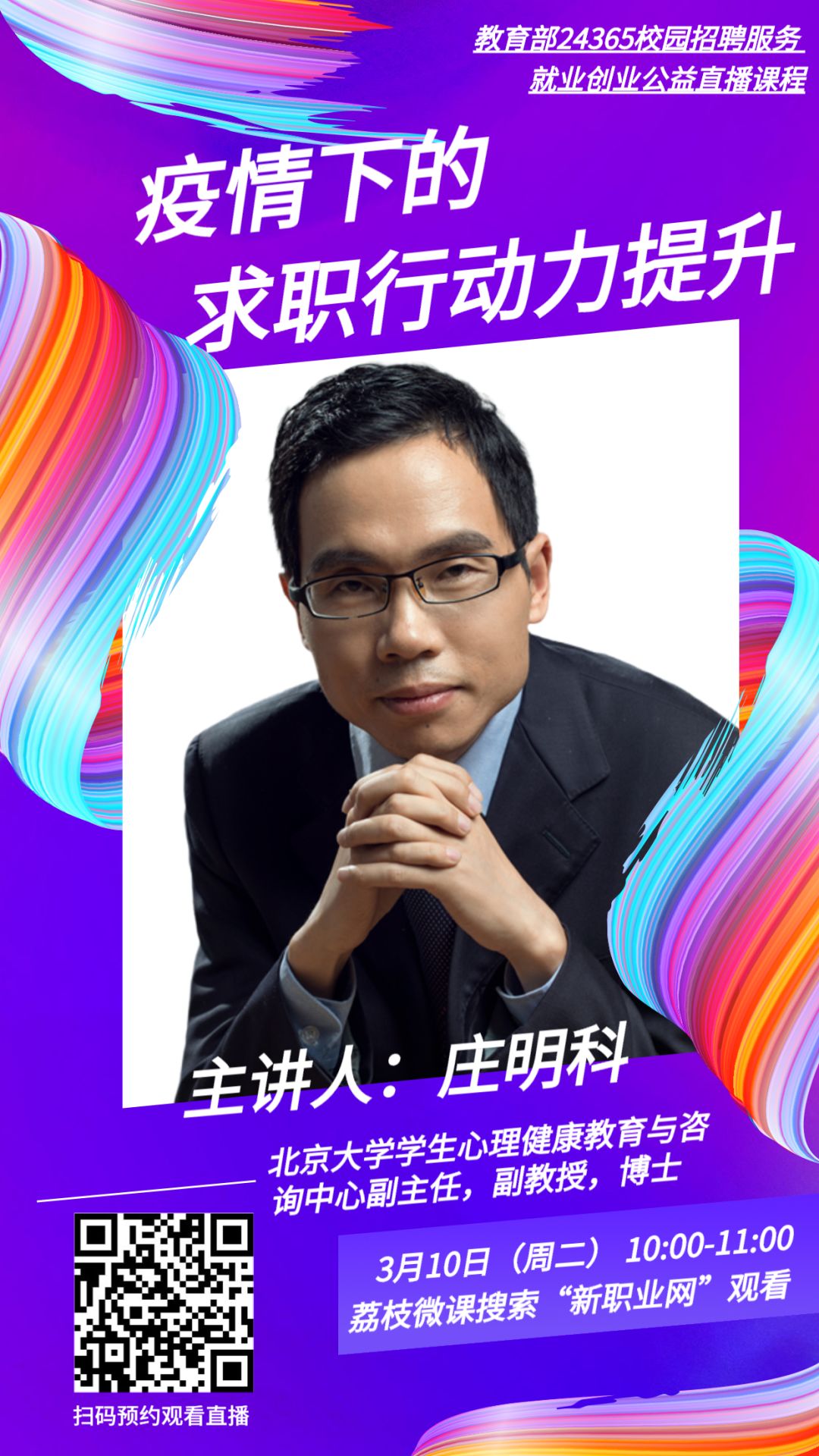 “教育部24365校园招聘服务 就业创业公益直播课程”第三课:《疫情下的求职行动力提升》,3月10日(周二)上午10点将在荔枝微课平台开讲。
