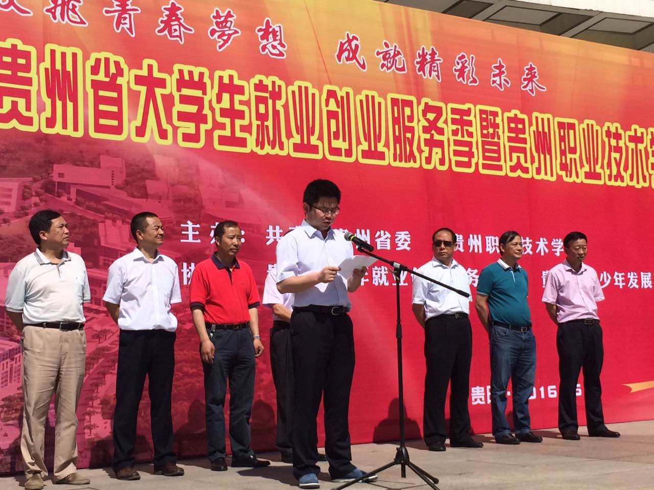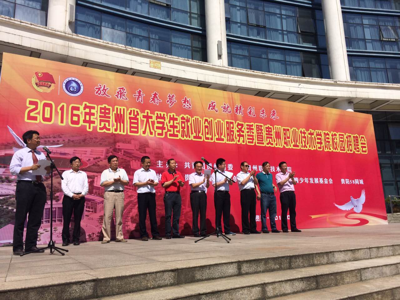 6月2日,主题为“放飞青春梦想 成就精彩未来”的2016年贵州省大学生就业创业服务季暨贵州职业技术学院校园招聘会隆重举行。上午十时,共青团贵州省委闵江涛副书记、贵州省青年创业就业服务中心(贵州省青少年发展基金会)任斌主任、贵州省普通高等学校毕业生就业工作办公室张华主任莅临学院指导工作,招聘会启动仪式由徐伟副院长主持,党委书记邓惠宾、院长李皖、党委副书记袁仁庆、郭万才、副院长龚辉、钱庆生出席活动现场。