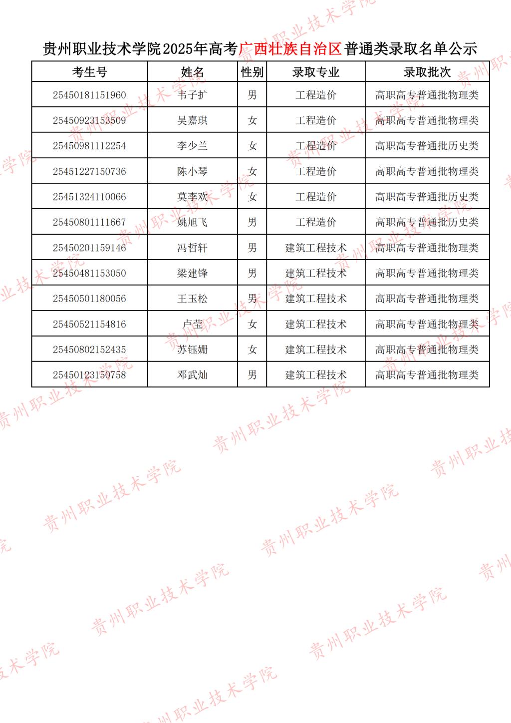 贵州职业技术学院2025年高考广西壮族自治区普通类录取名单公示